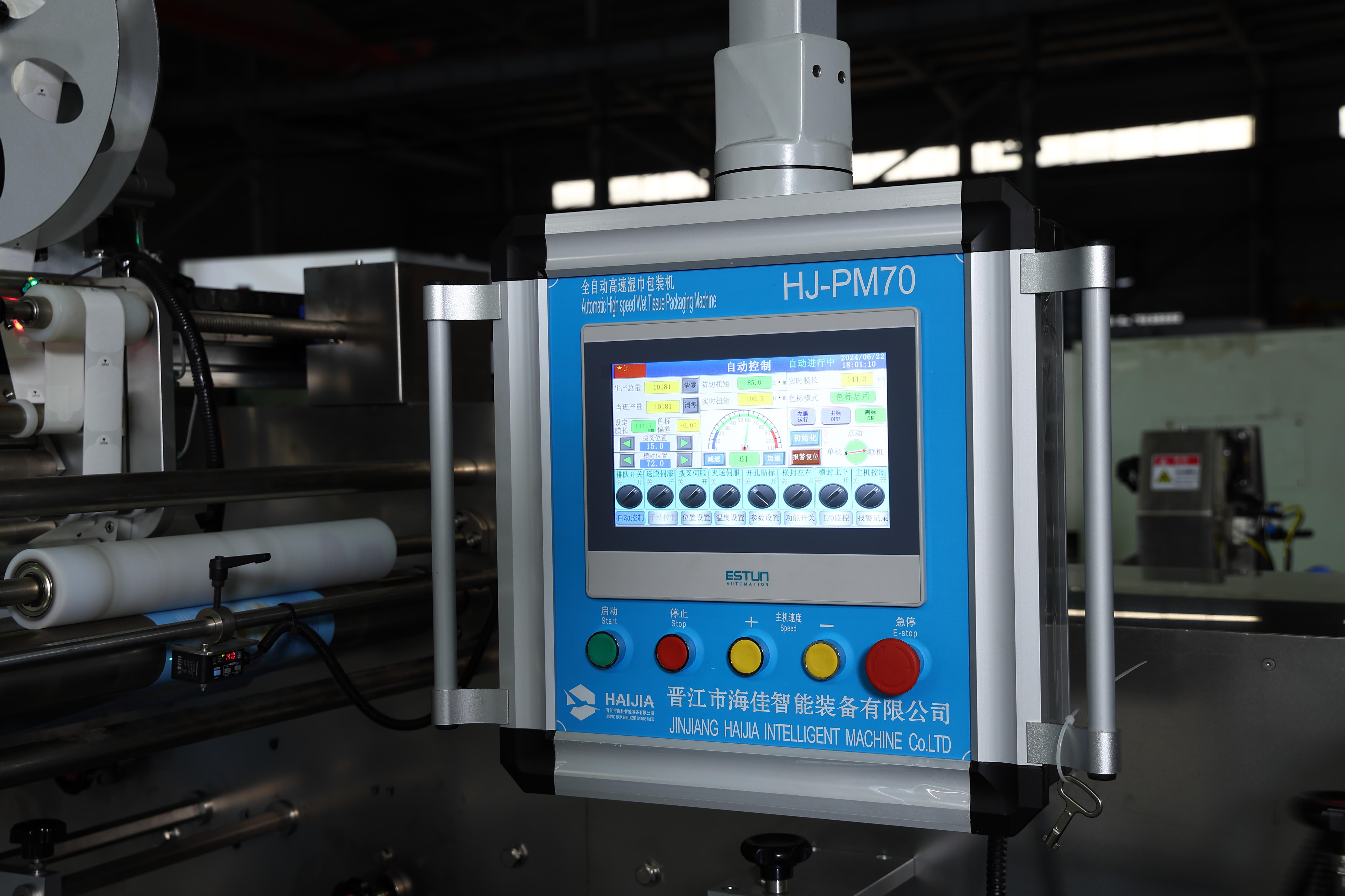 HJ-WP12A 大母卷全自动湿巾生产线采用伺服驱动控制系统,不停机接驳,实现真正意义上的全连续生产。HJ-WP12A全自动接驳湿巾折叠机(大母卷)可无缝对接HJ-PM70全自动包装机与HJ-LA75全自动贴盖机,组成完整的湿巾生产线。